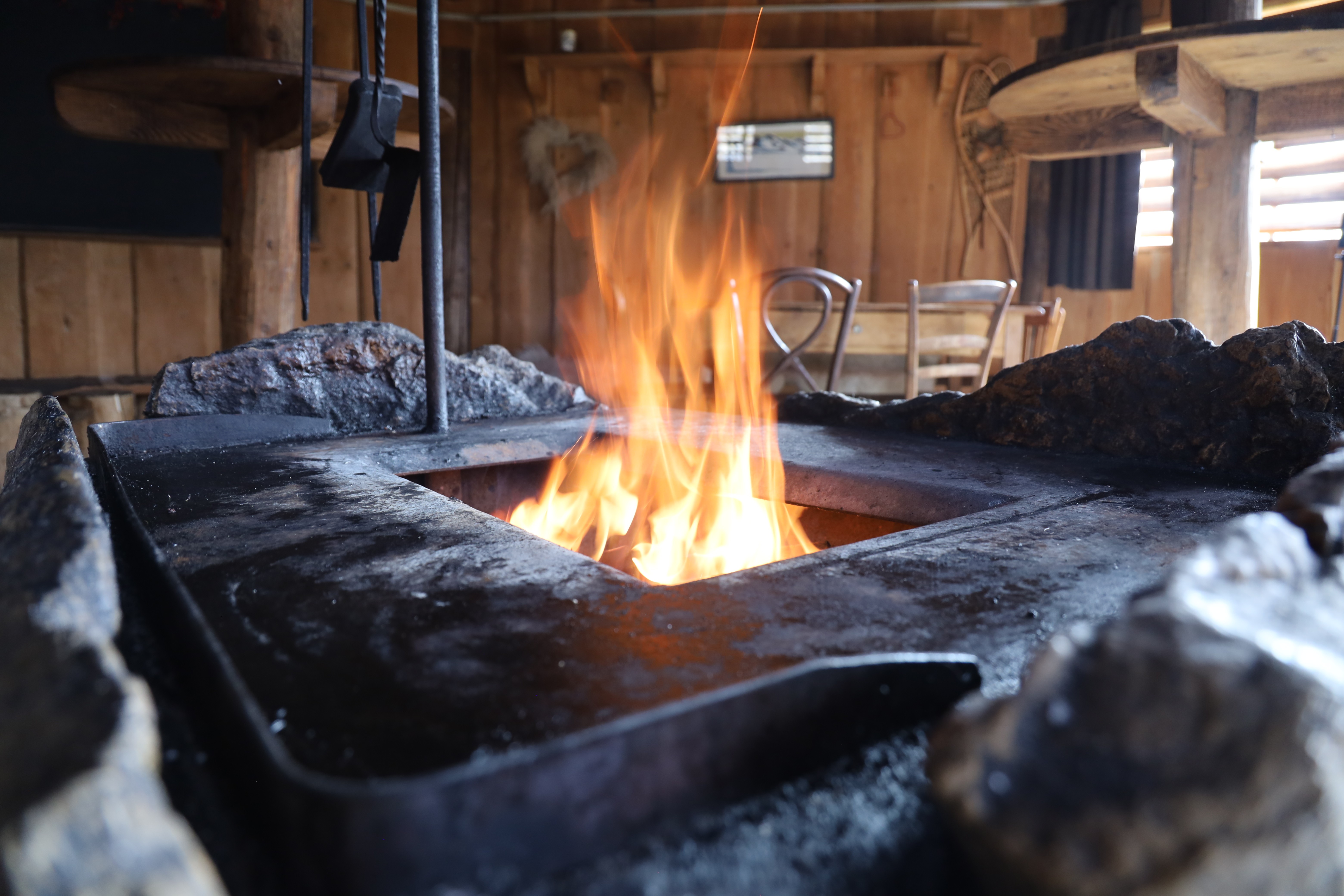 Le chalet hexagonal ouvert toute l’année, a été aménagé pour en faire un lieu de convivialité à la fois rustique, chaleureux et accueillant. Une fois la porte en bois refermée, les hôtes se retrouvent autour du foyer où crépite le feu de bois. Ici on commence par trinquer autour des mange-debout, avant de passer à table.